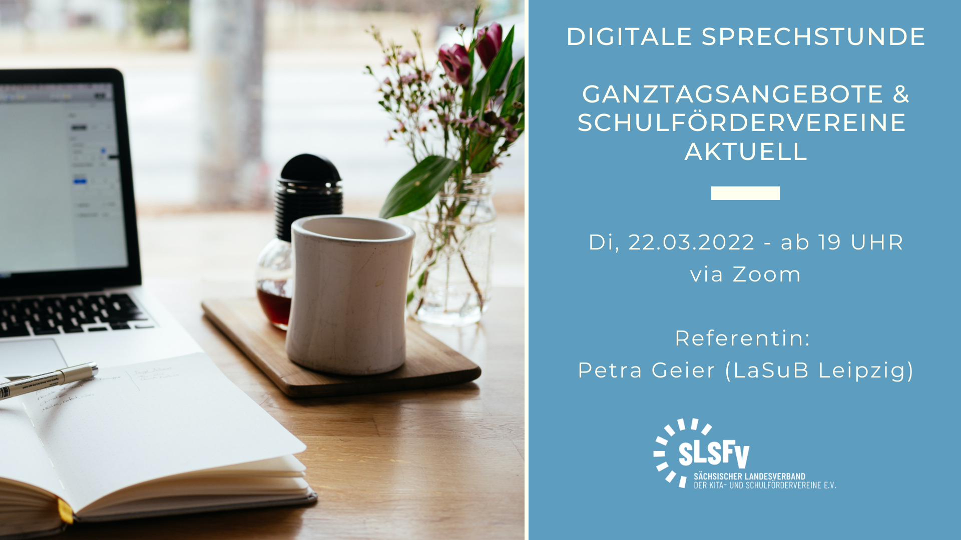 Wie bereits im vergangenen Jahr konnten wir für Sie erneut eine digitale Sprechstunde zum Thema Ganztagsangebote organisieren, zu der wir Sie herzlich einladen. Am Mittwoch, den 22.03.2022 wird es ab 19 Uhr via Zoom gemeinsam mit unserer Referentin Petra Geier (Landesamt für Schule und Bildung, Standort Leipzig) um aktuelle Fragen und Herausforderungen rund um das Thema Ganztagsangebote in Zeiten von COVID-19 gehen.